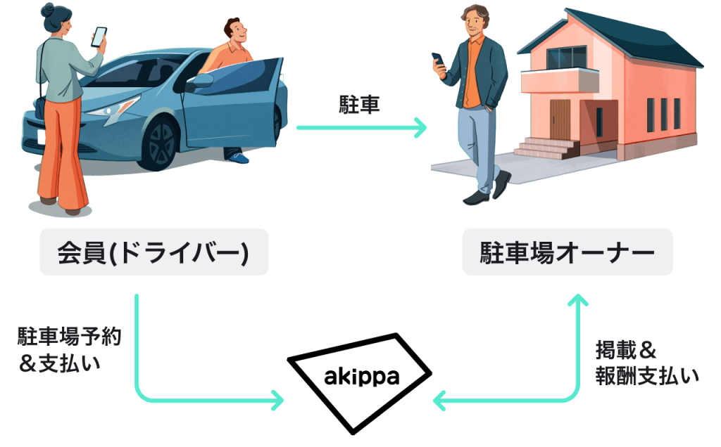 アキッパは、ドライバーと空きスペースをつなぐ駐車場シェアサービスです。